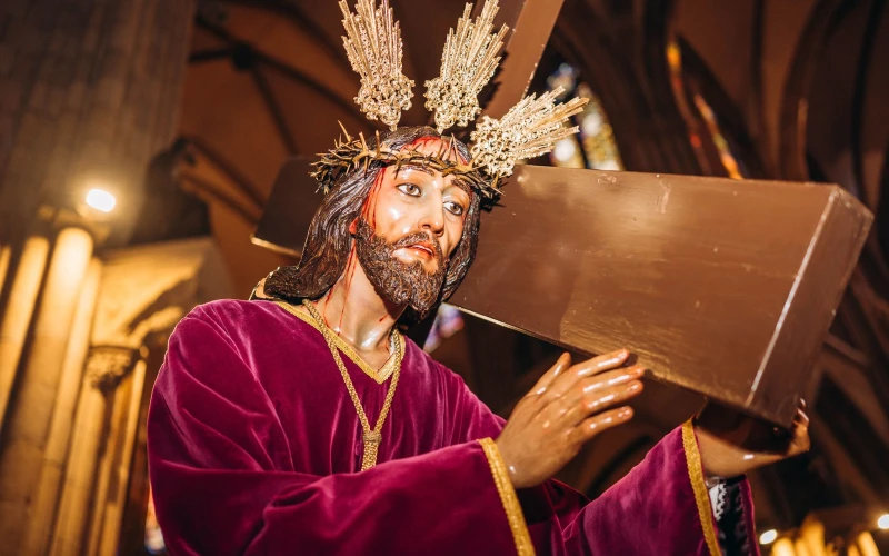 A continuación, los nazarenos, miembros de la cofradía, avanzaban en dos largas filas. Ataviados con las características túnicas blancas y los capirotes morados, portaban cirios encendidos, creando un camino de luz en la penumbra del anochecer. Su presencia marcaba la cercanía del paso central: la imagen de Nuestro Padre Jesús Nazareno, seguida de la de la Verónica, que recordaba el piadoso gesto de enjugar el rostro de Cristo. Estos pasos, cuidadosamente adornados, eran llevados a hombros con una mezcla de devoción y esfuerzo por los porteadores, quienes con su cadencia imprimían un movimiento pausado y digno a las esculturas.